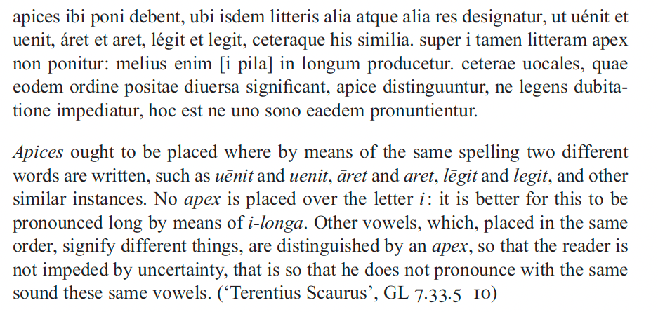 Having stated the rules which we must follow in speaking, I will now proceed to lay down the rules which must be observed when we write. Such rules are called orthography by the Greeks; let us style it the science of writing correctly. This science does not consist merely in the knowledge of the letters composing each syllable (such a study is beneath the dignity of a teacher of grammar), but, in my opinion, develops all its subtlety in connection with doubtful points. For instance, while it is absurd to place a apex over all long syllables since the quantity of most syllables is obvious from the very nature of the word which is written, it is all the same occasionally necessary, since the same letter involves a different meaning according as it is long or short. For example we determine whether malus is to mean an “apple tree” or a “bad man” by the use of the apex; palus means a “stake,” if the first syllable is long, a “marsh,” if it be short; again when the same letter is short in the nominative and long in the ablative, we generally require the apex to make it clear which quantity to understand.