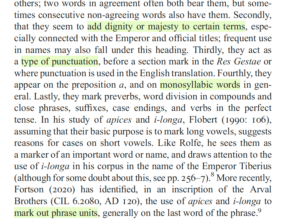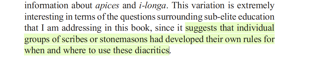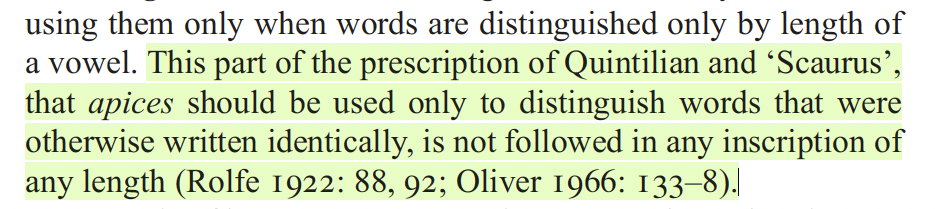 He states confidently “Diacritical signs first appear on inscriptions of the lastdecade of the second century B. C.” (p. 129) But then gives no examples! I want to scream. “The apex is found in thousands of inscriptions, and also inthe few surviving papyri and wax tablets, of the last six decades of the Republic and the first two centuries of the Principate,after which it becomes increasingly rare.” (p.131). I have learned from his footnotes our friend Garrucci tackled this subject, but that the author considers as the standard work: