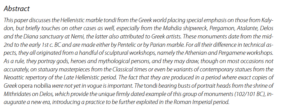 Leventi, Ifigeneia. “Μαρμάρινα μετάλλια (« tondi ») της ελληνιστικής περιόδου: μία επανεξέταση.” In Πολύτροπος : τιμητικός τόμος για τον καθηγητή Νικόλαο Χρ. Σταμπολίδη [Nikolaos Chr. Stampolidis]. 1, edited by Manolis I. Stefanakis, Mimika Giannopoulou and Maria Achiola., 567-582. Rethymno: Mesogeiaki Archaiologiki Etaireia, 2023. [available via academia.edu with many nice illustrations]