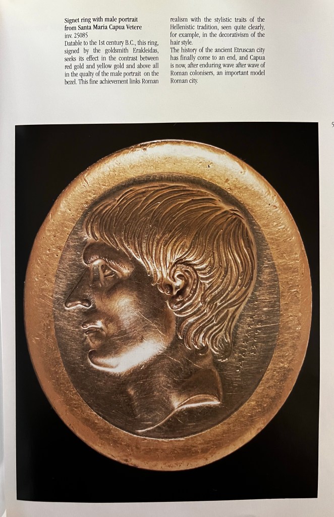Most seem to have become bored with this argument lately and have settled on a both/and answer. The royal die cutter was used to making royal style portraits but conceded certain details to give it a more authentically Roman air. All plausible enough, but the conversation seems to have done little to incorporate other evidence for Roman portraiture in the early period. Some items that might be contemporary are hard to date without archaeological context and poor comparative evidence. Take for instance this signet ring found at the site of ancient Capua and now in the Naples Museum: