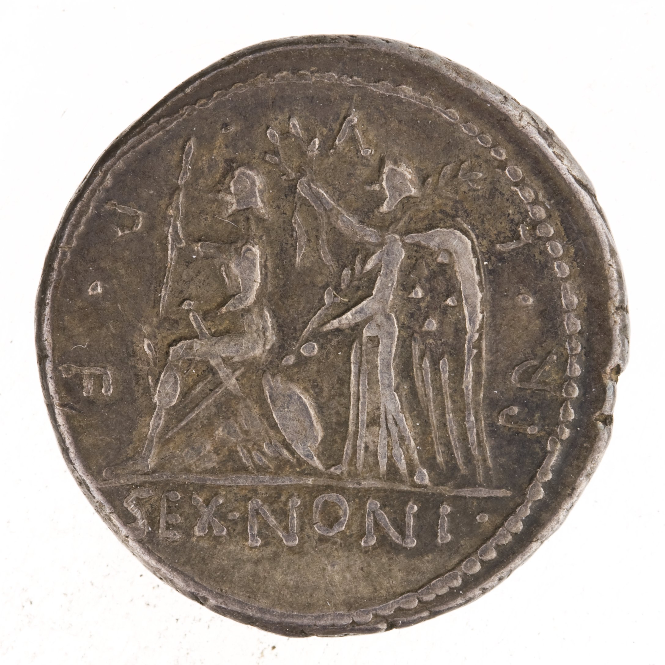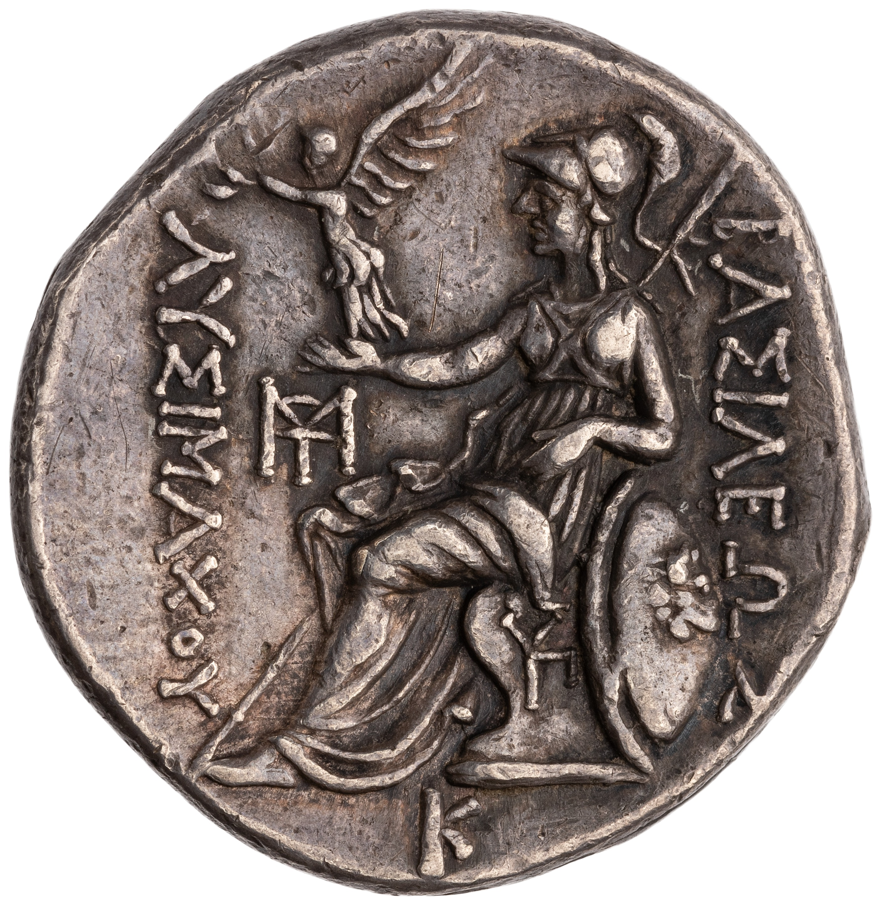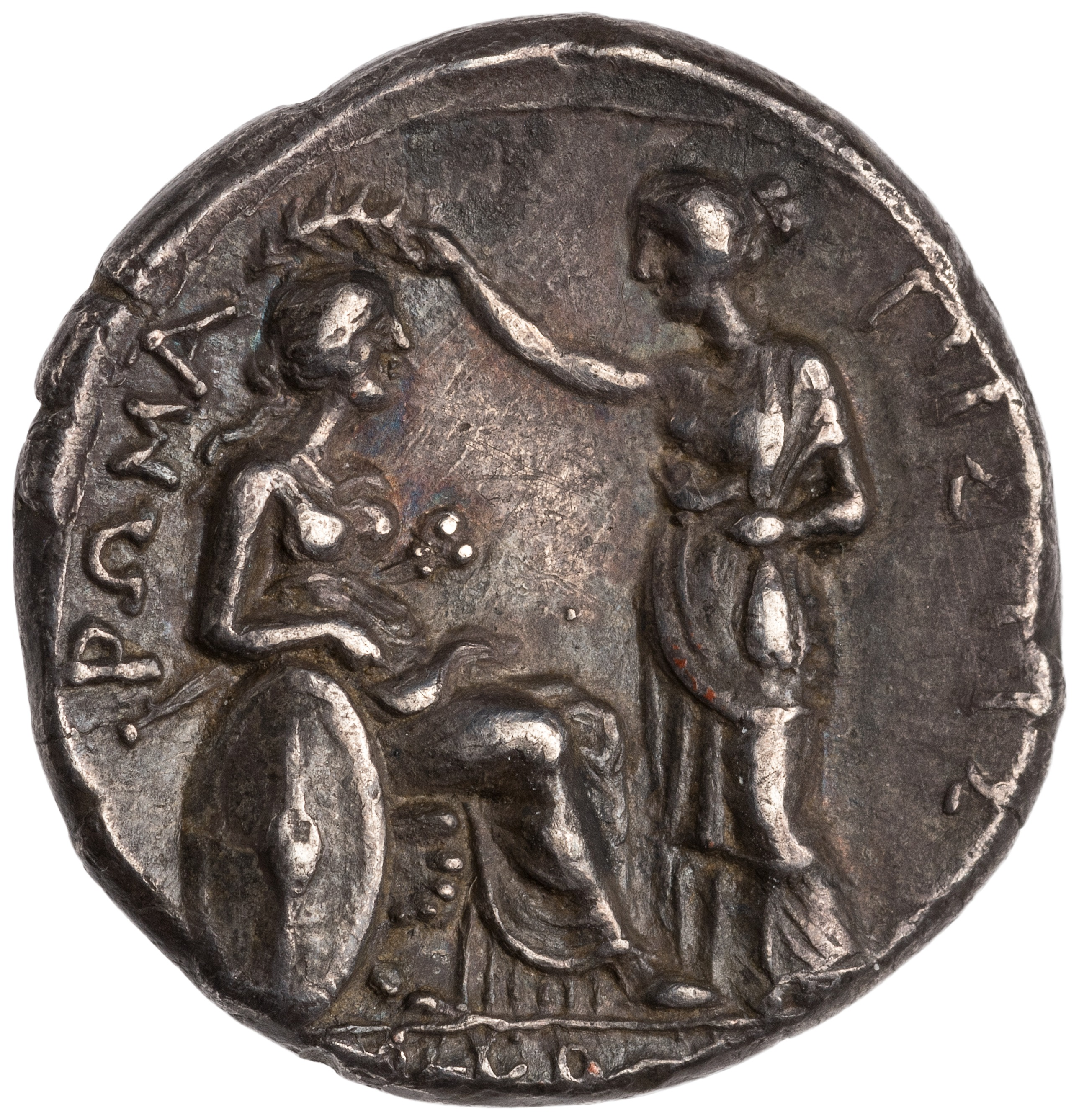 I found it asserted in an old gem catalogue (see p. xv under cat. no. 45) that Roma on a pile of arms derives from the Athena on the coinage of Lysimachus. It is certainly might be a basic prototype for personifications of Aetolia and Roma seen above but she is clearly enthroned with her own shield beside her, a very different symbolism than being atop the spoils of war.