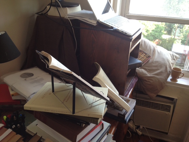And then I looked at my browser tabs. On average I have about 16+ web pages open, 7+ pdf documents, 4+ word documents, at least one spreadsheet, a few sticky notes, 3+ powerpoint files [I use powerpoint slides like the index cards of old for sorting notes, images, references etc.], the snipping tool, my dropbox file folder, skype, and then did I mention my problem with stacks of books: