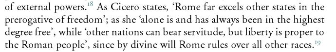 In the midst of a well-reasoned discussion of why libertas and victoria are linking in the Roman mind set, she drops in the bit about Cicero I quote above (p. 77).
