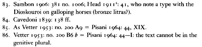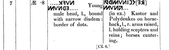This raises some questions in my mind about the readings of the first and penultimate letters on the first line. The old catalog reads them as R (Oscan for /d/) and D (Oscan for /r/). Rs and Ds cause no amount of confusion in their Oscan reversal, notably in antiquity at Larinum. The new catalogues (HN Italy and BM online) both read the same letter in both positions… r … by which I assume they mean an Oscan D … you see how the confusion can creep in!