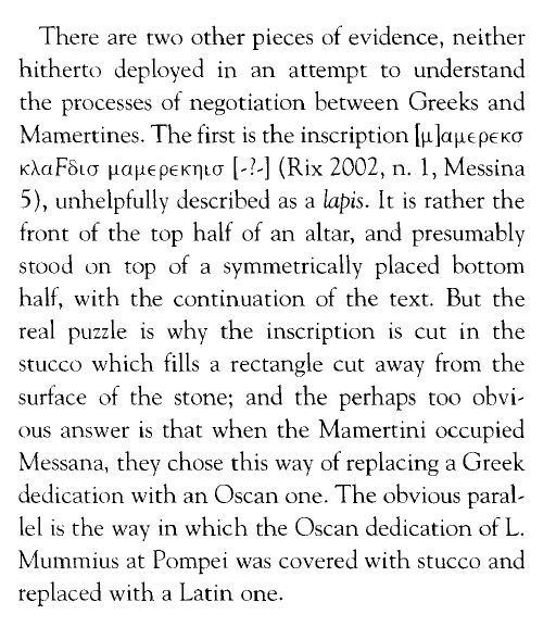 The one point I’m a little fuzzy on is did anyone actually record seeing a Latin inscription on the plaster over the Oscan one in Pompeii?   Or are we just assuming it must have had one?  Also could some high tec imaging process allow us to see under the Mamertine stucco inscription to let us read what if anything it is covering up?