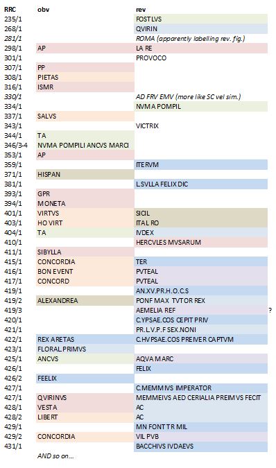 My groupings are pretty subjective, pink for hard to recognize gods, peach for divine qualities/virtues — aren’t those two pretty much the same thing? Green for Kings, but then I threw in Faustulus because where else would he belong in these categories? Blue for the accomplishments of individuals. This can be hard to separate from the moneyer’s name and titular. A slightly darker blue for military accomplishments and a slightly lighter blue for religious acts. Purple is for buildings and monuments, but not statues. Mud is for personifications of place. I’ve left uncolored others that are not readily paralleled elsewhere in the series.