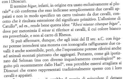 It can be argued, therefore, that at the beginning of the second century. B.C. a bigatus was a coin with iconography depicting two horses: it is sustainable, moreover, that the term could also refer to mounted animals rather than yoked. Therefore, as suggested by Seltman previously (but with a different chronology), followed more recently by Harl, it may have been used to describe the Dioscuri who were often traditionally represented with their horses as a pair.”