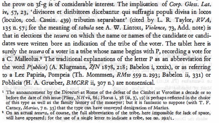 It is a remarkable coincidence that all of these types, RRC 292, RRC 335, and RRC 384, all made by different moneyers from different families each represent a voting ballot* with the letter P. I find it hard to accept that in each case the P stands for a tribe. Why would they all select the same tribe or initial if it is indeed generic? Compare the voting tablets market V for V[ti Rogas], RRC 413 and also as a controlmark for Piso Frugi (obv. 33, Crawford 1974: table XLII), or the A[bsolvo ] C[ondemno] of RRC 428. I think the P needs a bit more investigation.
