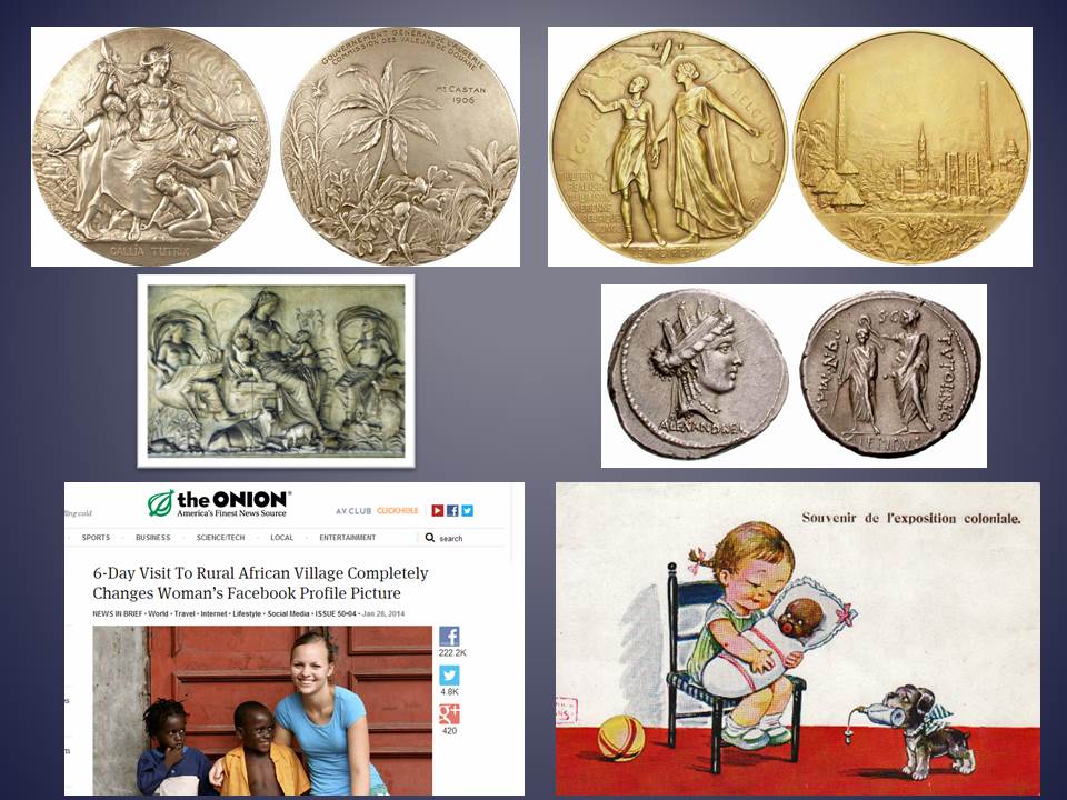 …However in its more romanticized version we can easily see how Roman models are once more adapted to meet the ideological needs of Colonial Europe. Beyond the obvious visual parallels and basic elements such as hierarchy of scale, also notice parallels in language in the legends. We have Gallia Tutrix in the upper left hand picture and in the middle right Lepidus the Tutor of the king, tutor meaning guardian in Latin. The middle left image from Augustus’ ara pacis is probably not a personification of Empire but rather of the earth and harmonious bounty she can produce under the Roman peace. However that peace conceptualized as a gift of empire and the later European adaptations simply take out a conceptual layer by making the female figure the personification of the imperial power in her own right. And of course we have our now very familiar our palm trees and huts and rays of light. This idea of motherhood rather than fatherhood as a metaphor for the colonial relationship is of course not restricted to medallic art. This is a postcard making a joke about the popularity of the French 1931 colonial exposition, what has been called by some commentators a human zoo. And This is an Onion article lambasting today’s voluntourism and its propagation of colonialist values from this past January.”