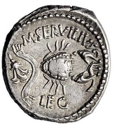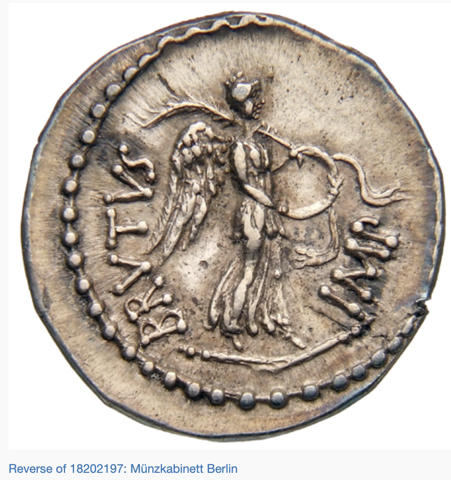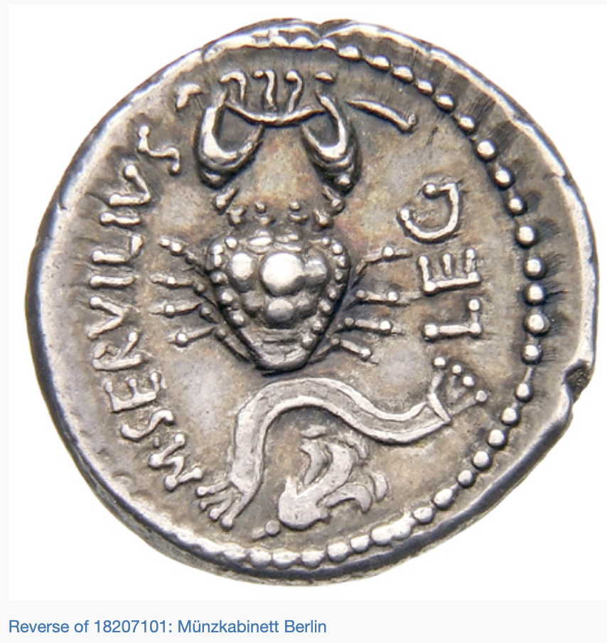 Crawford is silent on the symbolism of diadem saying only: “Part of one issue of Cassius records his capture of Rhodes after a battle at Myndus, opposite the island of Cos; the rose of Rhodes and crab of Cos both figure, together with an aplustre as a symbol of victory” (p. 741). I must say, the aplustre doesn’t seem very victorious to me as it is clutched in the claws of the crab. Or perhaps its just Cos offering the naval victory to Cassius…