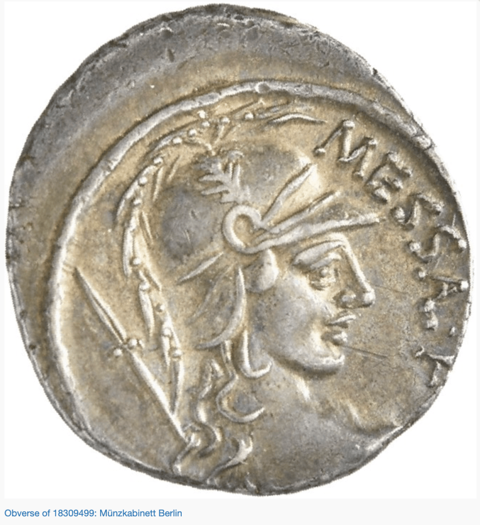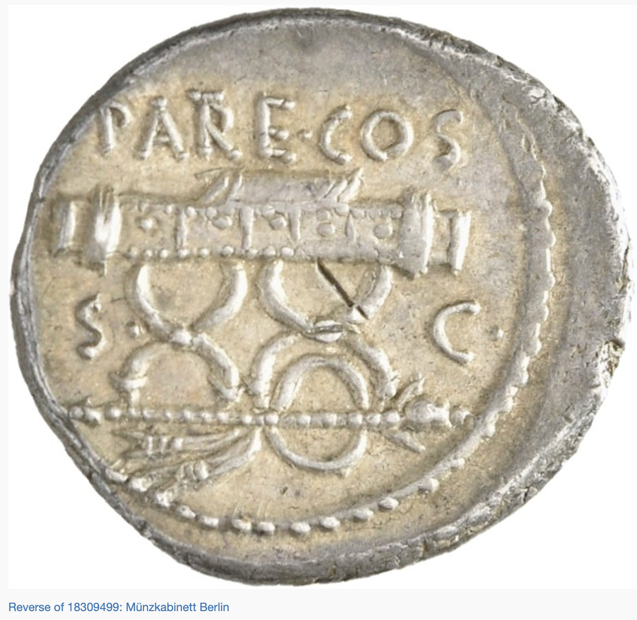 This seems to be the earliest coin (c.53BCE, RRC 435/1) in which the symbols of Hellenistic kingship, the diadem and the scepter, are used in such a way as to suggest their rejection in favor of the traditional symbols of Roman power in this case the curule chair. For this coin, the context is the threat of Pompey assuming sole control of the Roman state.