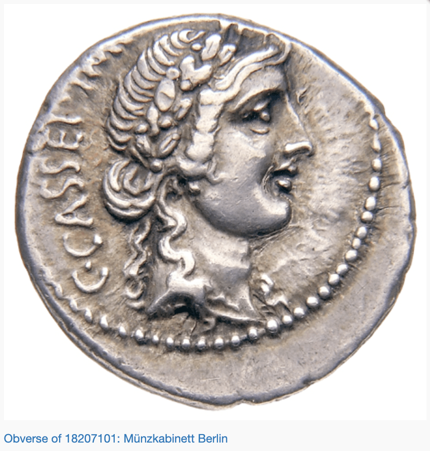 The Cassius coin is often connected to this quote from Plutarch’s Life of Brutus 30: