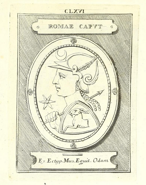 Notice the emphasis put on rendering Roma’s hand clutching the spear before the shield. Also notice the variation in shield designs.