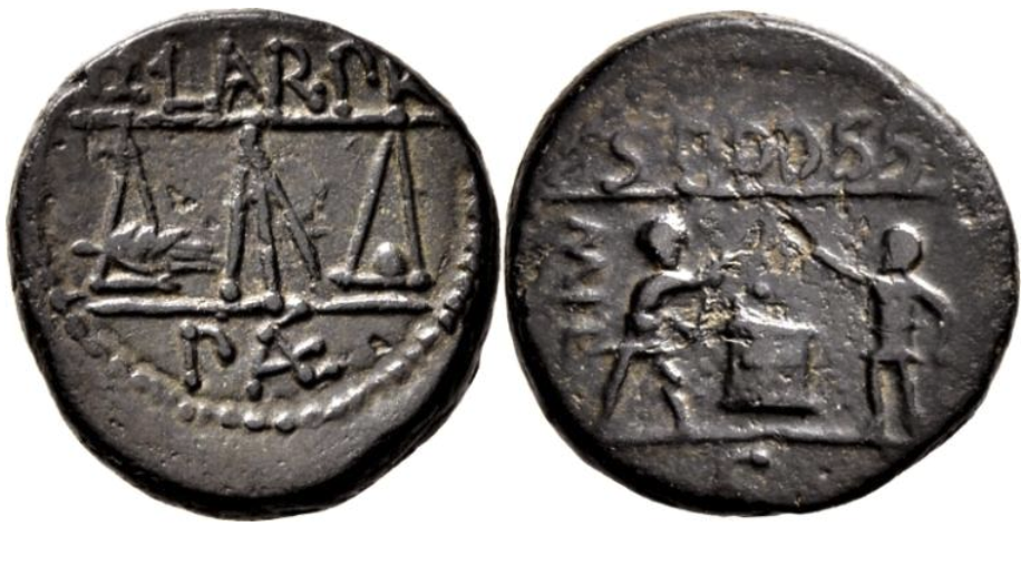 “Paestum. Semis early first century, æ 4.28 g. Q· LAR·PR Scales weighting ear of corn; in exergue, Pæ. Rev. SPDDS·S Two workmen in the act of coining; in field l., MIL. In exergue, S. SNG Copenhagen 1372. M. Crawford, Studies Price, Paestum and Rome. The Form and Function of a Subsidiary Coinage, 25/1. Historia Numorum 1238.” [specimen in trade]