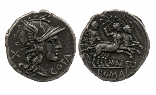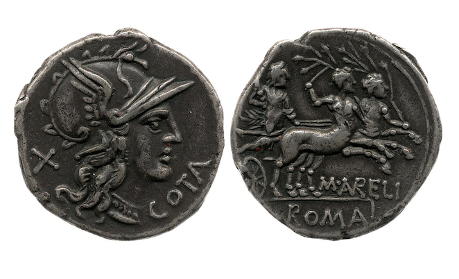 I’m working on illustrations for the book and hence have been looking at a good number of specimens. One of the fun things I noticed about some, but not all, specimens of RRC 229 is that they take the time to represent bottom half of Hercules’ lion pelt. No. 1 on the image above shows the care taken to represent the fur of the lion scalp, but look a no. 2! that a tail and more furry pelt flying out behind the god. Fun. By contrast other dies reduce the pelt to just a little squiggle of flying drapery, as in the image below.