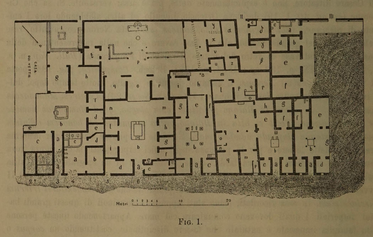 “Along the eastern side—and that aforementioned section of the southern side—runs the rainwater channel, unusually wide and lined with red plaster. Originally, the peristyle most likely housed a masonry *triclinium* (dining couch), surfaced with *opus signinum* and sheltered by a pergola supported by small octagonal columns clad in green stucco. Subsequently, during a renovation of the house, the masonry *triclinium* was demolished; only a portion of the western couch remained intact, serving as a solid base upon which to rest the walls of a vaulted niche—complete with a small pediment—which, having been decorated (perhaps at a later date) with shells and mosaics, was destined to become a fountain. Still standing there today is a handsome travertine wellhead—fluted and capped by a slab of *bardiglio* marble—and, situated directly in front of the niche upon that same solid base, a circular masonry *monopodium* (pedestal), surfaced with stucco imitating *giallo antico* marble and adorned with moldings and a relief decoration of small leaves, likewise executed in stucco.