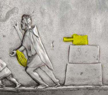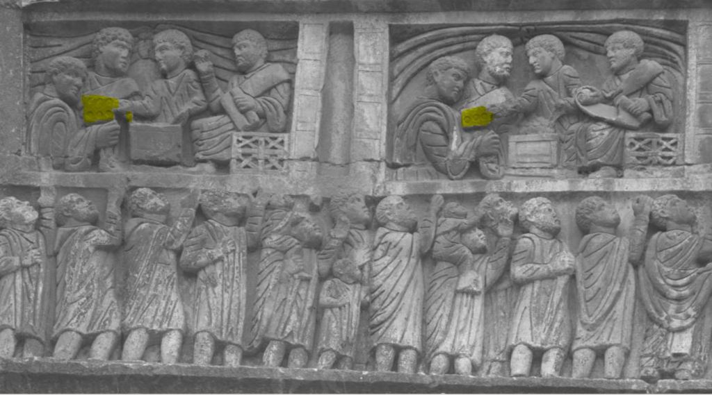 This might make the basket one full of bread being distributed as part of largesse. I can find images of bread baskets, but none just this shape and no images of bread as part of ritual handouts for all we know it happened. The closest I can get is this synagogue mosaic: