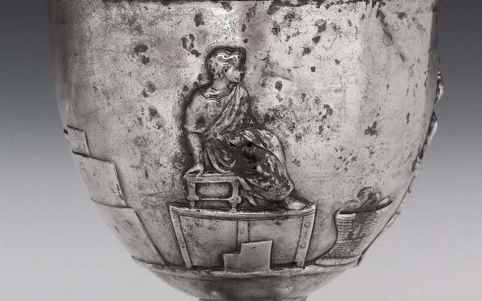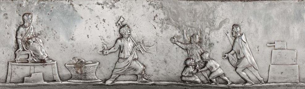 Dude with an axe is holding it in his left hand. He’s not about to execute anyone, but if we compare to other sacrifice scenes he’s not unlike the figure leading the bull to sacrifice it’s just that the collar is empty. Has the silver been over cleaned? Repaired?