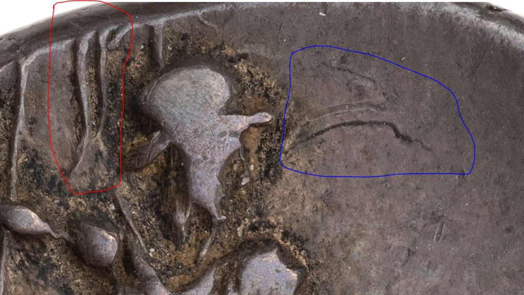 The image reproduction of the coin isn’t great (YET!) so I was looking to see if it could be improved in some way as the ANS images are exceptionally hi res. I noticed some funny features. Circled above. Red could just be the helmet and Blue could be damage, but …