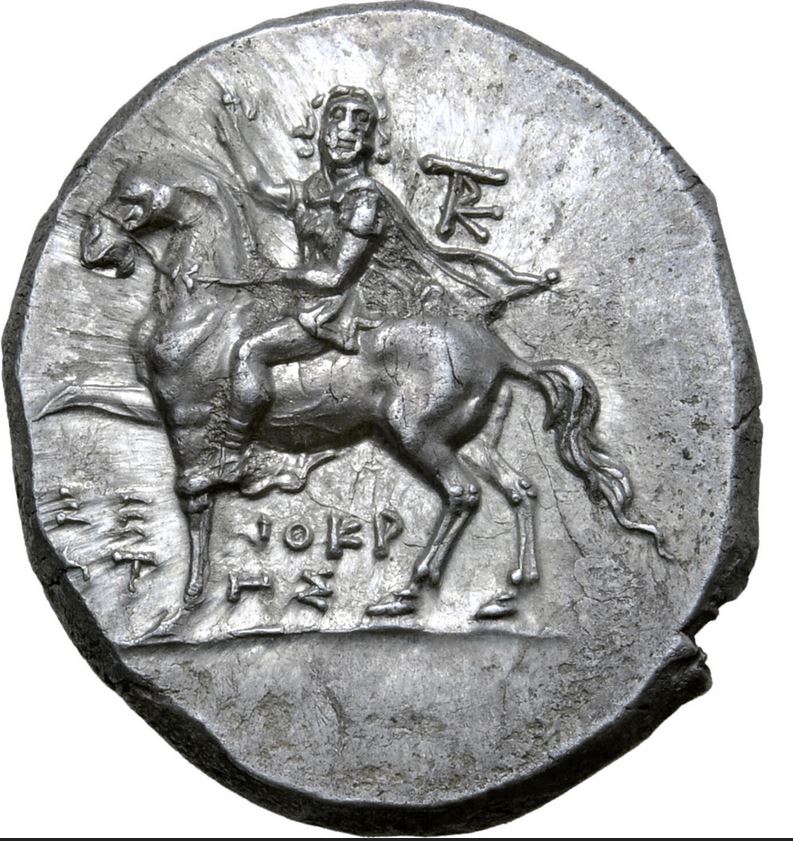 Very intrigued by this turn and wave almost portrait like obverse depiction. I want to think more about it in future, esp. the free flowing Alexander/Helios type hair in lieu of a helmet or other head covering. Link to specimen.