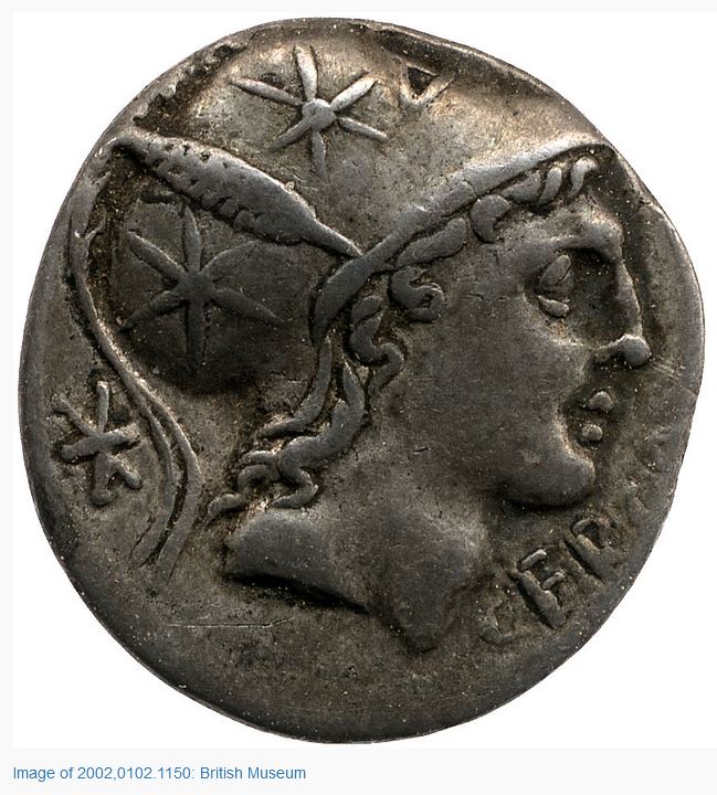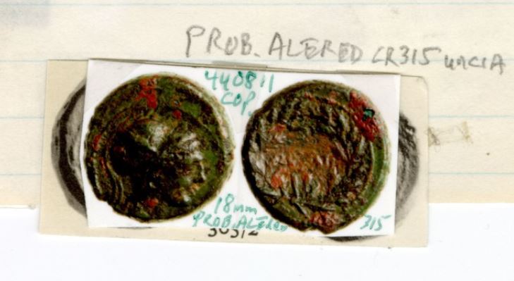 Schaefer was concerned that this Copenhagen specimen might be an altered RRC 315/1. I don’t think so but that is primarily based on the obverse. The obverse of this Copenhagen specimen has a bump on its nose, a recessed chin and and a helmet with a side feather and maybe some stars. The rendering of the Roma on the obverse of 315/1 is far more traditional and stylized.