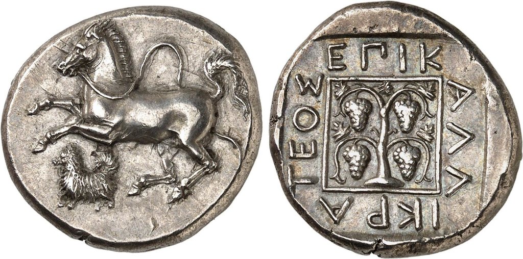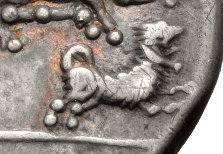 And why a dog? I’m going to go with loyalty-fides resonance; see me on Ulysses and dogs and Fides. This particular dog type is some times called a Maltese or Proto-Maltese and will be familiar to many numismatists from a wide variety of coins.