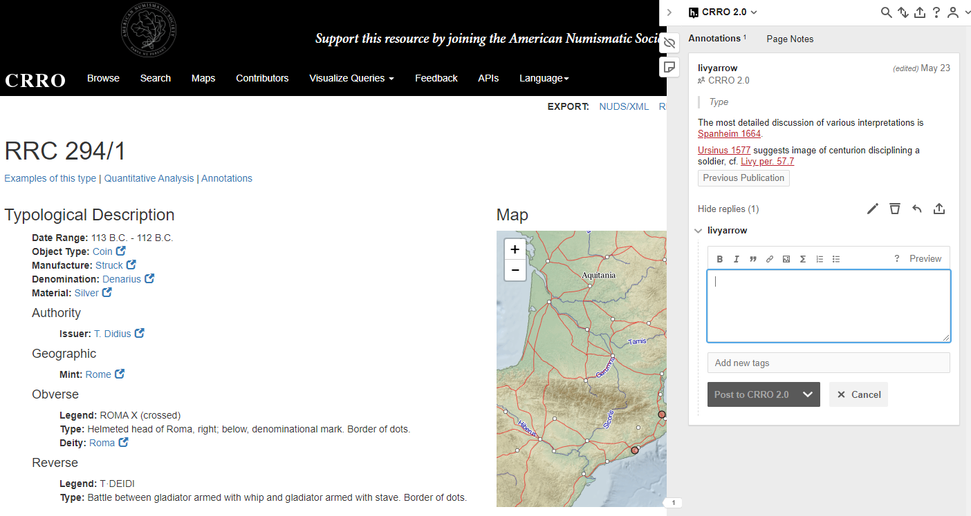 This talk shifted from slides to discussion of this twitter thread as an example of how online platforms (social media, including message boards) can be places where serious knowledge sharing and expertise takes place. I also demonstrated hypothes.is and how it could be used to collaboratively annotate and connect CRRO to past and present scholarship, either publicly or in dedicated working groups. This could mimic and expand the personal marginalia many of us already have added to our personal copies of RRC. I pointed out that this works for existing typology but has limited functionality for integrating new types.