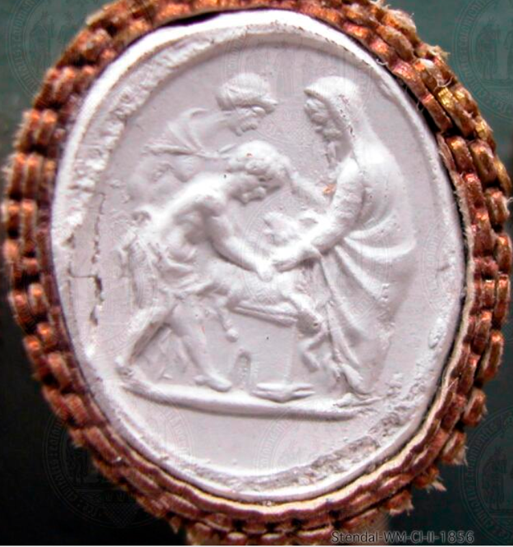 Glasspaste. A scene of animal sacrifice, but appears to be a domestic context. Notice it seems plausibly a mother father ans sun. about to slay the goat. What is on the ground near to the father’s feet in front of the altar. J. J. Winckelmann, Description des pierres gravées du feu Baron de Stosch, dédiée à son Eminence Monseigneur le Cardinal Alexandre Albani (1760), 307, Kat.Nr. II,1856 Zenon Sammlung Stosch, W Cl II 1856 Arachne entry for plaster cast.