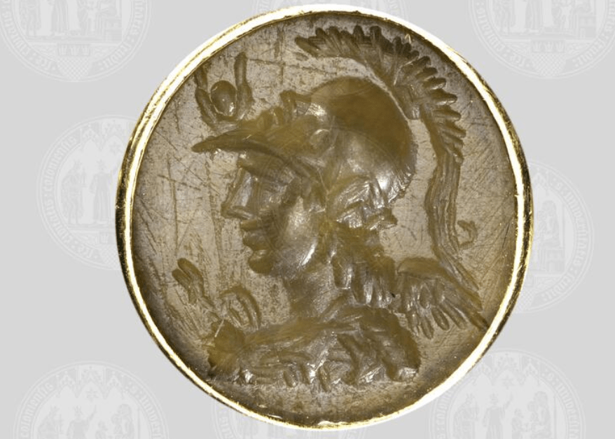 I see imagery/attributes associated with Isis and Athena and Victory but cannot quite make out what is in her hand. Can you?