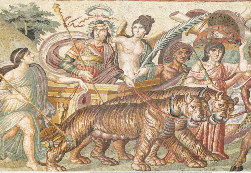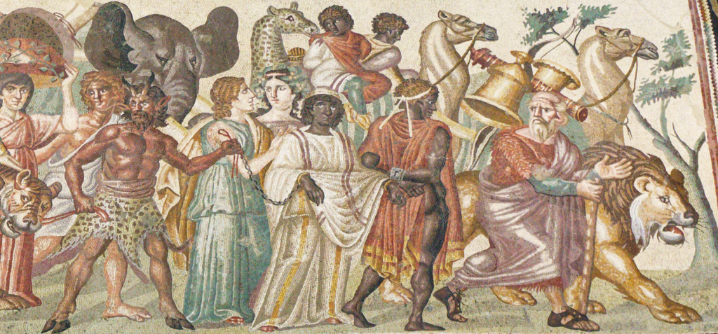 How would this read to a Roman veteran assigned to this colony or the children of such veterans as they lived in a north African landscape? The artist makes a clear distinction between the heroic/divine as white/pale skinned, the tanned/brown of the fauns and satyrs (non-human), and the black/dark brown of the bound captives. The image of Dionysus esp. Victory holding a crown above his head and riding in the chariot recalls imperial triumphal imagery.