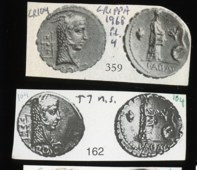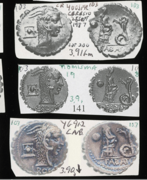 RRC 412 : L. Roscius Fabatus’ issue like Papius’ uses paired control marks (and also celebrates Juno Sopita). Some pairs repeat but some see unique to Fabatus. We saw the groma in my last post, but there are other fun examples of Roman technology on this series.