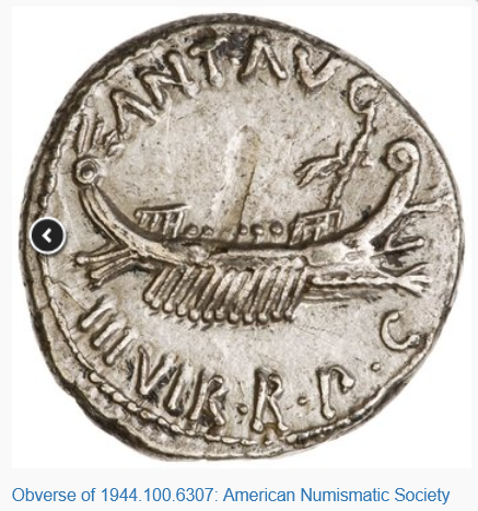 Notice the while ‘sticks’ coming out from the stern. These made me think of the filleted scepter on Antony’s coinage: