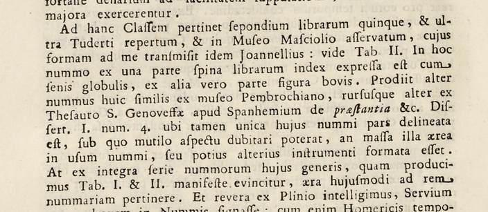 Joannellius supplied Passeri with a drawing of a specimen found beyond Todi and kept in the Museo Masciolio (do you know where or what this was? do tell!). Similar bars are said to be in the Pembroke Museum and another said to be in the Treasury of San Genovese according Spanhiem, but the latter in very poor condition. For all my skimming of Spanhiem I’ve not (yet) found this testimony. I was reading 1.4. It’s an disquisition on the great coin collections and collectors Europe so interesting none the less.