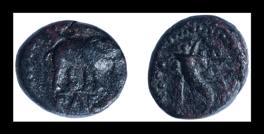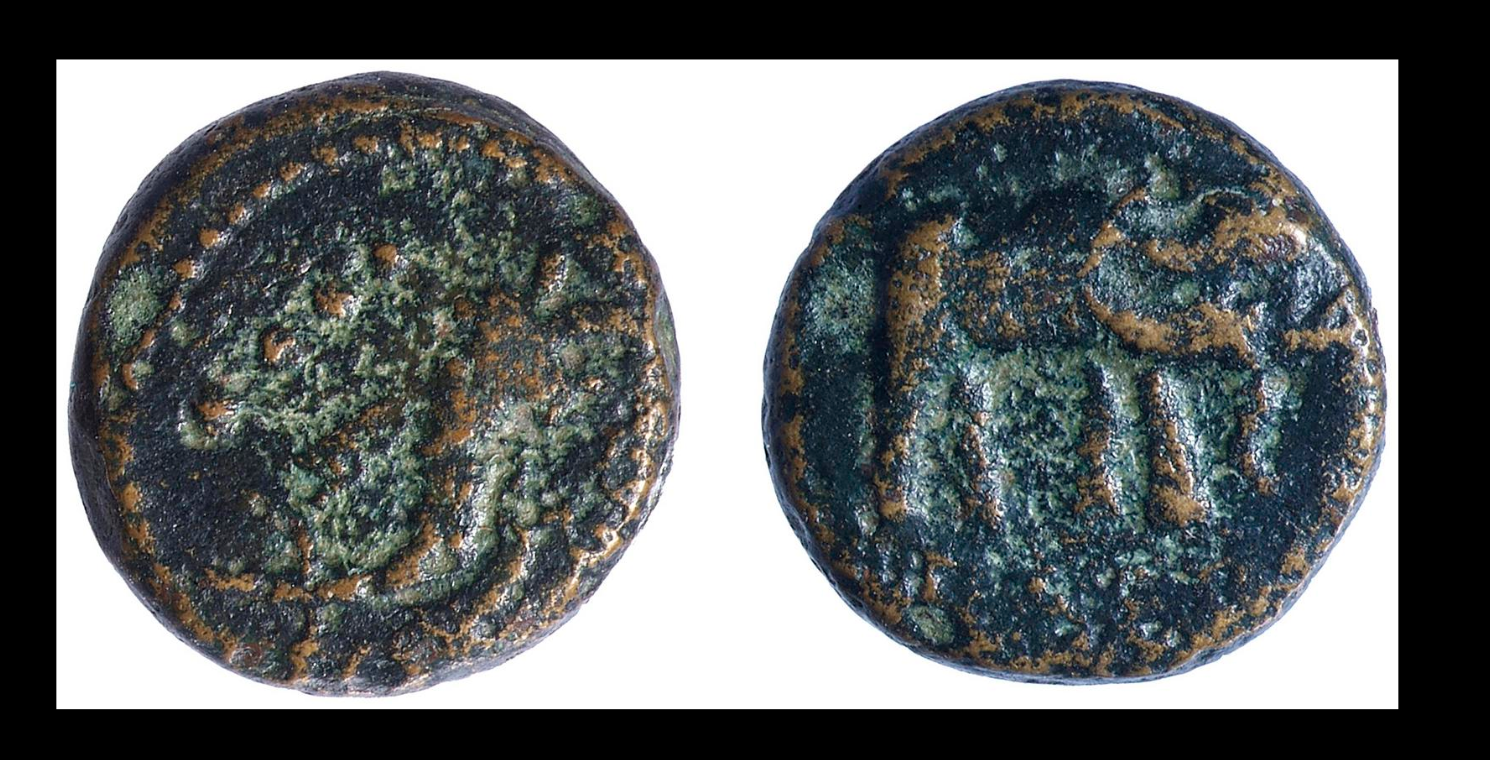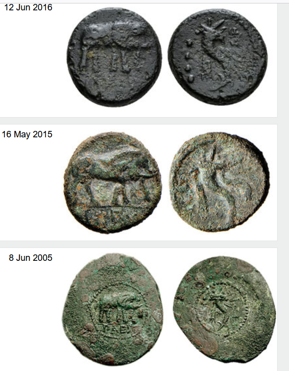 Because this object is stamped the curators speculated that it might have been created using the impression of a coin. The inspiration is clearly elephant type from Paestum, but gold-piece doesn’t look anything like specimens I’ve seen. The gold elephant looks more Indian and the bronze coins more African. Also I’ve just never seen a Paestum bronze in that good of condition. Crawford, Paestum 21/2; SNG ANS 777; HN Italy 1230.