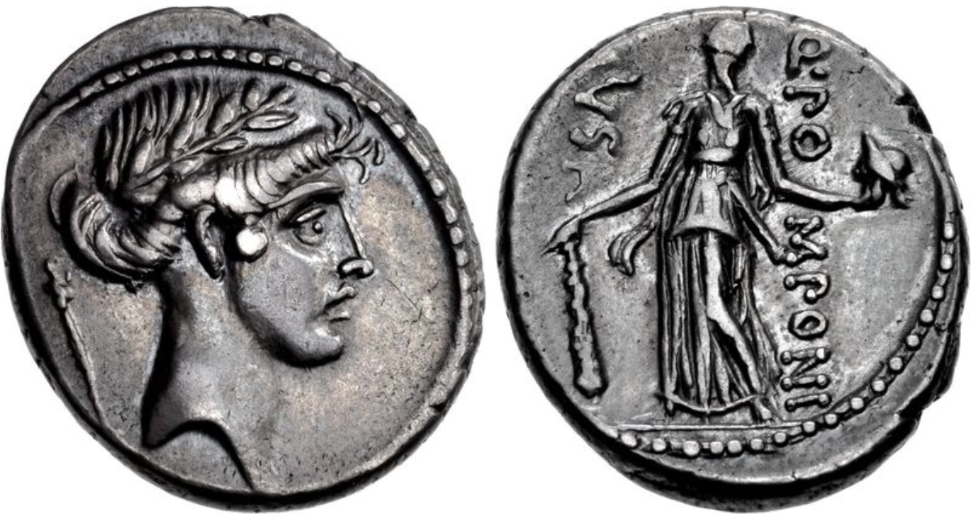 Melpomene often dresses as a hero from the stage, but most typically she has the attributes of Hercules, as on the coins of Pomponius Musa (RRC 410).