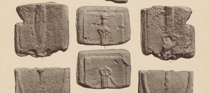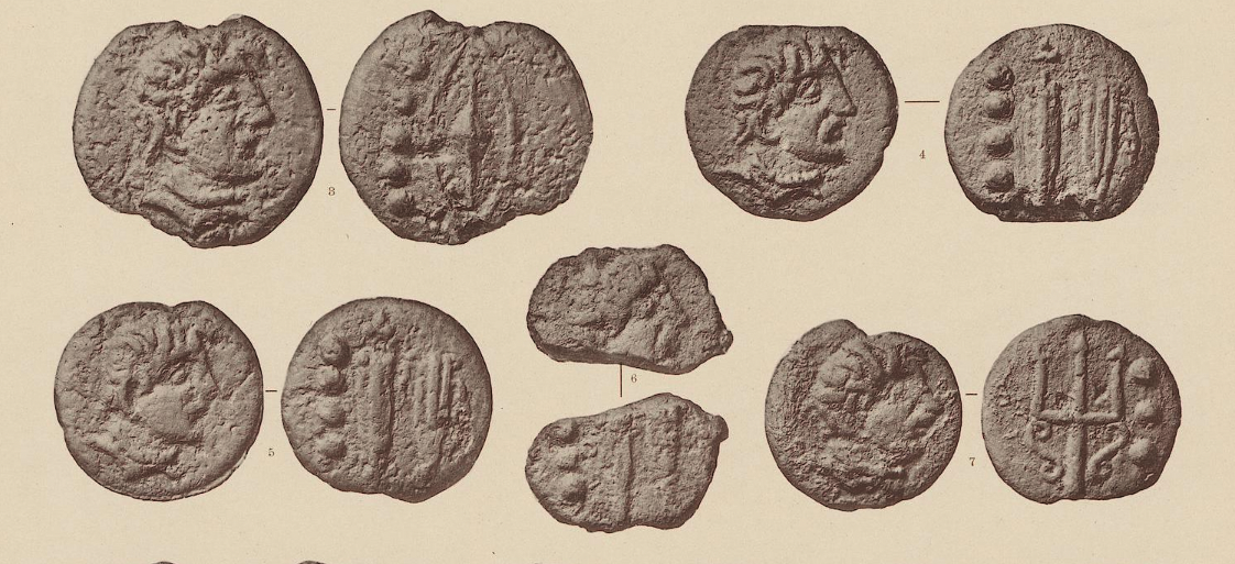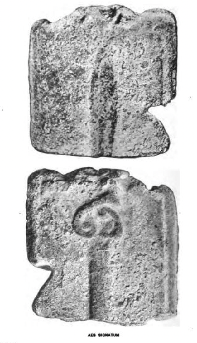 I’ve floated the idea in print that the denomination designs of Ariminum’s early cast bronze may be related to the so-called aes signatum (Roman currency bar) designs. In the below images look at the four dot specimens (quadrunx).