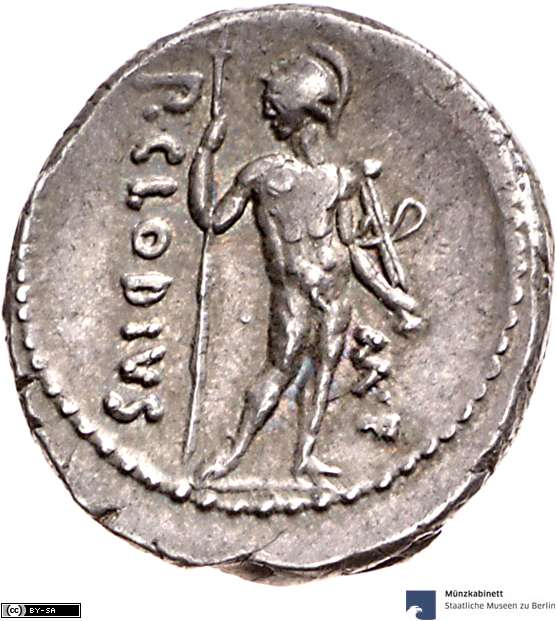 Berlin specimen “RRC Nr. 452/3 (datiert 48-47 v. Chr.); B. Woytek, Arma et Nummi. Forschungen zur römischen Finanzgeschichte und Münzprägung der Jahre 49 bis 42 v. Chr. (2003) 142-151. 558 (Münzstätte in Illyrien, Apollonia?, spätes Frühjahr bis Mitte 48 v. Chr.).”