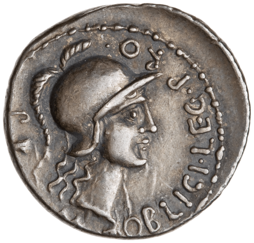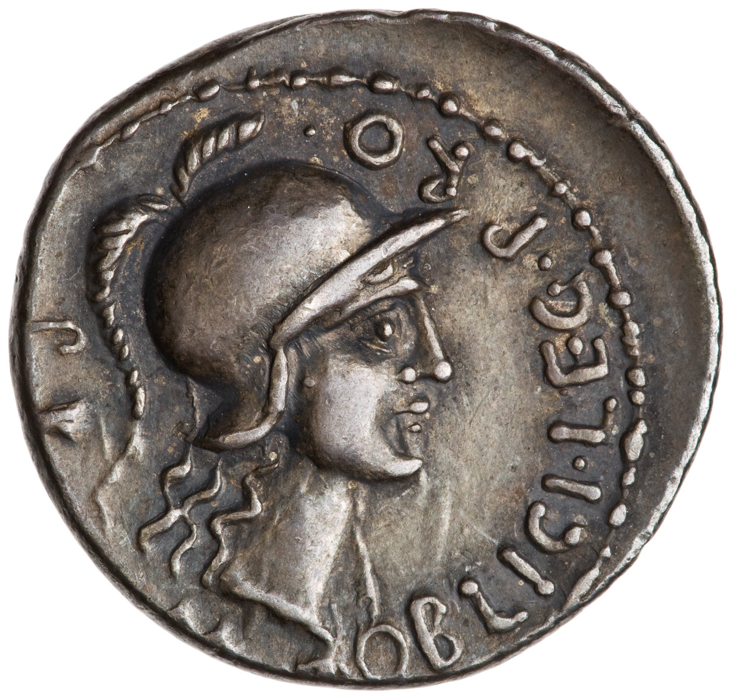 I was looking up Mars in the index of Woytek’s Arma and Numma to make sure I hadn’t missed something on the reverse of 494/16. (I was tweeting about this latter type yesterday, wondering if it’s Mars was at all related to the testimony of the vowing of a temple to Mars Ultor on the eve of the battle of Philippi, Suet. Aug. 29.2; Ov. Fast. V.569‑578). What I found instead was his ID of the above obverse as Mars not Roma, and I could not agree more.