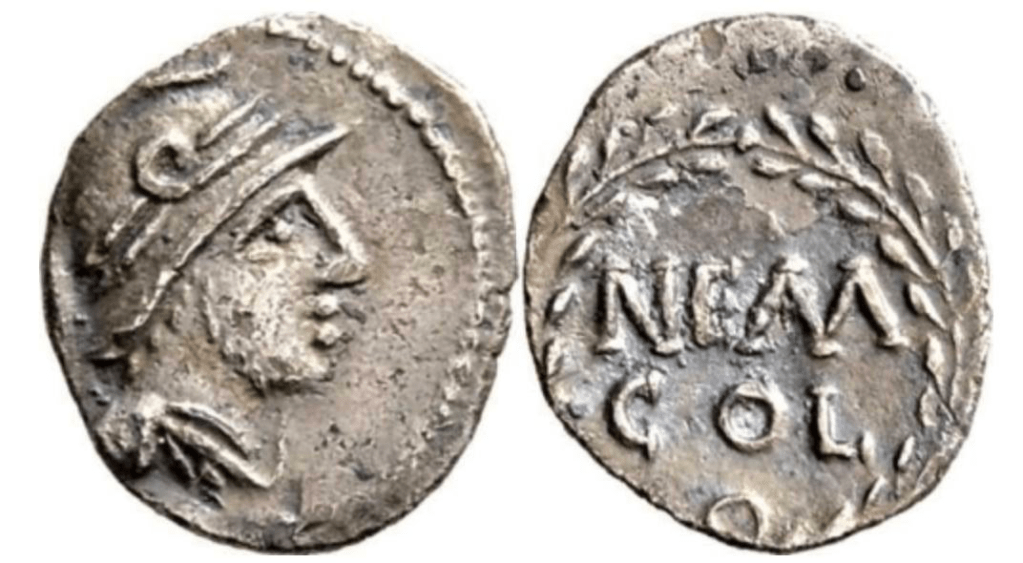 Look at this lovely teeny tiny coin! 11 mm and weighing on average just .38 grams! It was made c. 40 BCE in the Roman colony at what is now Nimes, France. What I love in particular is how the obverse reminds me of young Mars on republican coins and the wreath plus inscription of the small late uncia struck at Rome and other wreathed reverses from Sicilian bronzes struck by Romans https://rpc.ashmus.ox.ac.uk/coins/1/519. RPC 520 and 521 have the same head on the obverse.