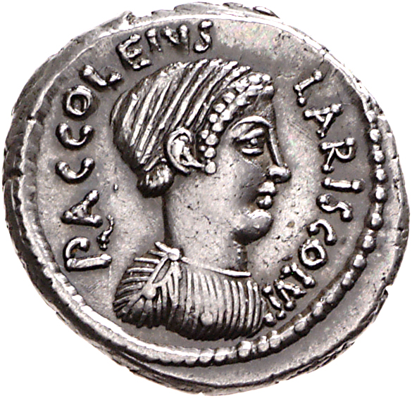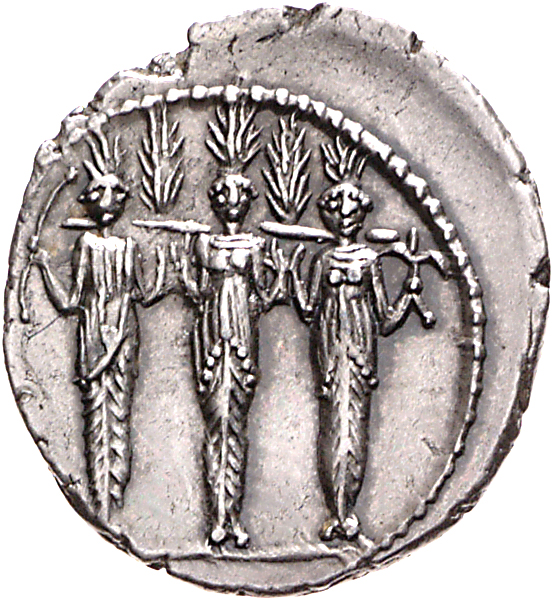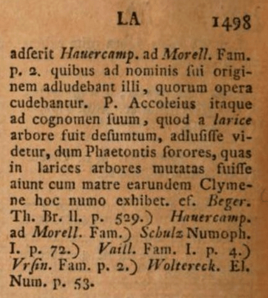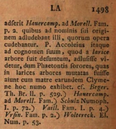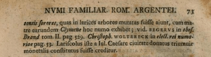 Smyth 1856: 2 describes two specimens of RRC 486/1. He discounts an unattributed description of as the Caryatidae, and favors seeing it as the metamorphosis of the three Clymenidae, sisters of Phaeton, with the obverse being their mother, Clymene. He quotes in Latin a line from Havercamp. The view is over a hundred years old by the time Smyth paraphrases. AGNETHLER 1746: 72-73 (next set of images) makes explicit what Smyth only implies. The attraction of this interpretation is based on the moneyer’s cognomen LARISCOLUS being derived from larix: the larch tree. The idea was that the three figures are turning into these trees. Smyth rejects an idea he attributes to Cavedoni that the obverse represents Acca Laurentia and that the money is thereby associating he gens, ACCOLEIUS, with the mother of the Lares and more over implying a connection between his cognomen and these protective deities.
