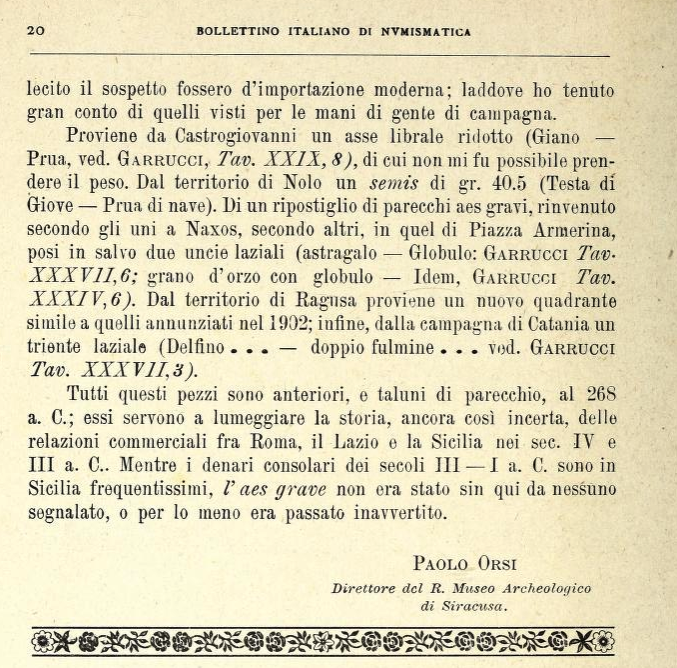 In the News of the excavations (1902, p. 217-218) I announced the discovery in the territory of Visrini (Catania) of a one libral standard uncia of Latium (astragalus [knuckle-bone]; Garrucci, pl. XL, fig. 40) and in that of Ragusa of two Latin quadranti (Head of Hercules – Prow of ship). These three pieces would have been the first specimens of aes grave found, or at least reported, in Sicily, and introductory, it should be noted, not by modern coin dealers, but in antiquity. Following the discoveries of 1902, I have noted others in the following years; and I have always used the greatest scruple in eliminating those pieces that have fallen on the antiques market, for which there may be