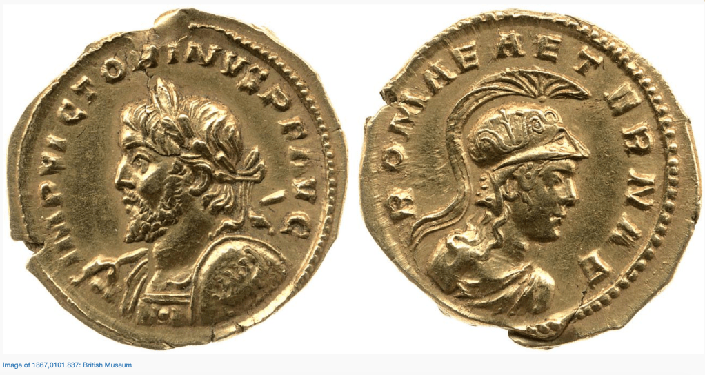 More than anything the style of the gold and glass reminds me of the artistic style of Contorniates, but I don’t yet own the standard reference catalogue for those. I think it is the long face. I’m not sure if there are any Roma/Virtus contorniates… Must check… (cf. Alföldi Contorniates 77 and p. 26, 10, no spear, Cf. Alföldi, Kontorniat, 70/493; )