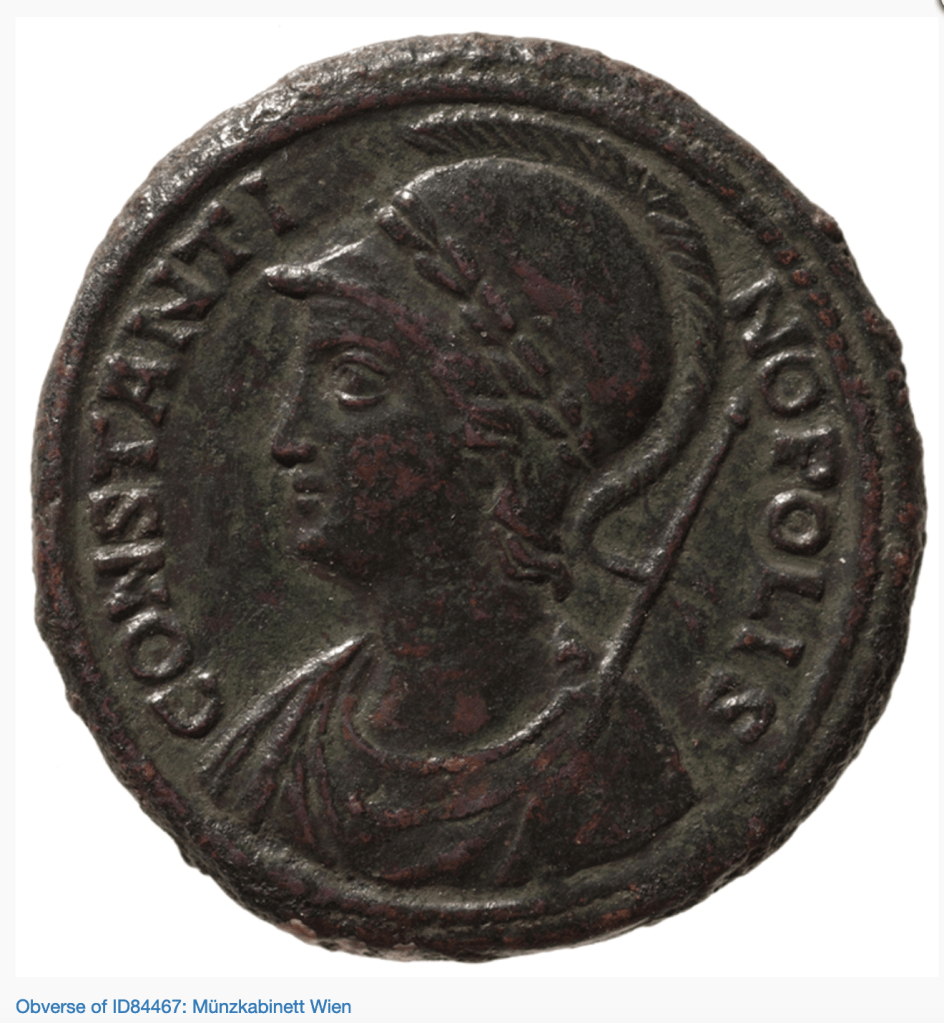 The closest parallel seems to be with personifications of Constantinople but no triple crested helmet and it is a scepter instead of a spear.
