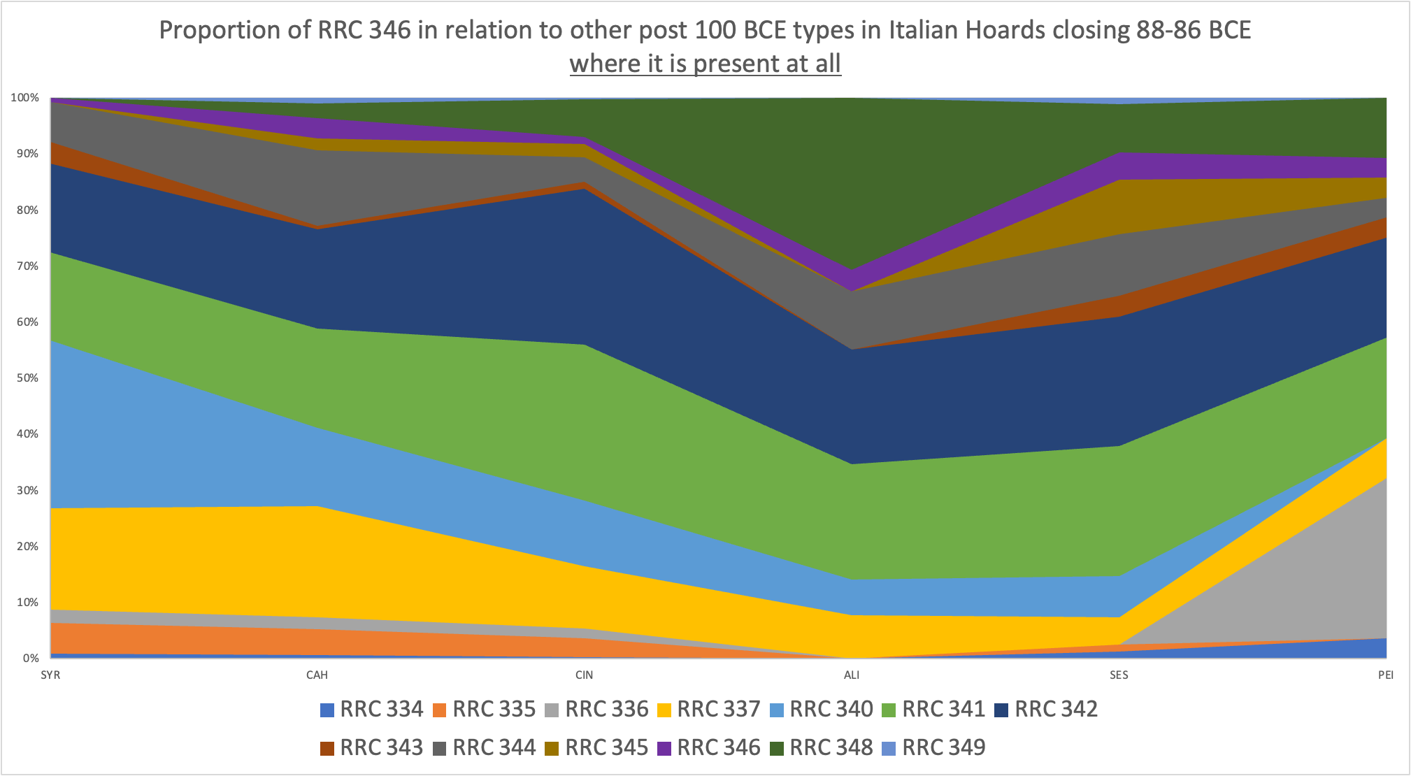 There are seven hoard from Pennisular Italy and Sicily from the period 88-86 BCE (a narrow window to be sure!) in the CHRR database. Of these only 5 contain RRC 346.