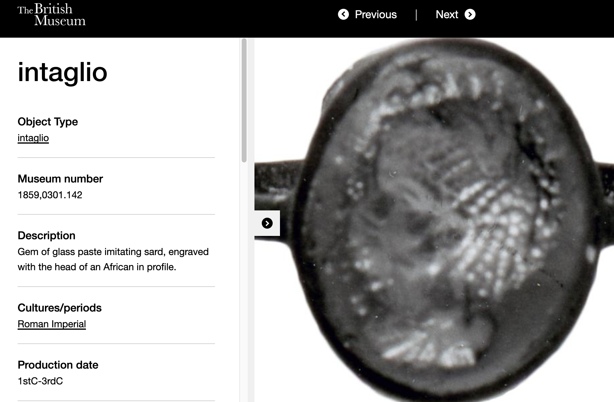 I would note that similar heads also with twisted hair styles and earrings but facing left appear relatively frequently on glass paste intaglios from Italy (as well as some in more precious gem stones).