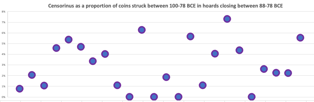 This hoard closes at 87BCE and contains only 83 Denarii the vast majority dating 91 or later. Once it is removed the trend line for the presence of the Dossenus issue in the remaining hoards is nearly perfectly flat. There is no evidence the hoard was intentionally excluded in any systematic way.