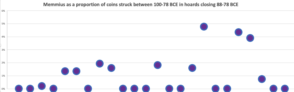 While it appears in far fewer hoards and never makes up more than 5% of the proportion 100-78BCE coins in these hoards, there is again no downward trend over this initial decade.