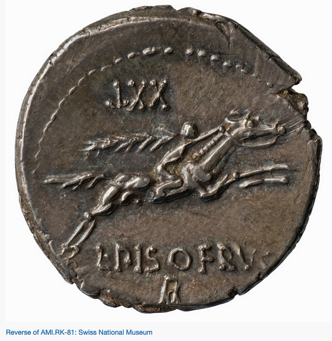 I have an extensive unpublished paper on the importance of the ludi Apollinares in the late republic which is slate to be a chapter in the new book. These two coin types will both feature in that chapter as will RRC 346/1. But for now what I’m really interested in is Censorinus’ decision to imitated Piso’s earlier issue. By contrast his bronze types are really innovative (Ostia on Bronze: cf earlier post). Even his other denarius is doing something relatively new. The Ancus Numa jugate heads might draw visually on RRC 307 and 312/1 (the only earlier jugate heads on the Roman series is a v rare semuncia from Luceria but I’m not even sure that counts); and the use of legendary kings probably was inspired by RRC 344 (Tatius). Desultors appeared in a slightly different form on RRC 297 (early blog posts on desultores). The Apollo horse coins echo a massive v recent series. I wonder if the nature of these borrowings on the silver might be a means of making the coins blend better with the coins most common in contemporary circulation. An attempt to illicit an ‘oh that’s familiar’ feeling in a moment of deep civil crisis.