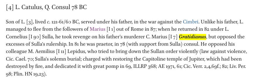 “At the end of the 80s he was legate to Sulla (Sall. Hist. 1,46) [2. 110ff.]. He probably did not murder his brother [3. 1688], but he probably killed M. Marius Gratidianus (Q. Cic. comm. pet. 10; Ascon. 84; 90C), the brother of his wife Gratidia (Schol. Bern. in Luc. 2,173; Sall. Hist. 1,45) [2. 105f.]”