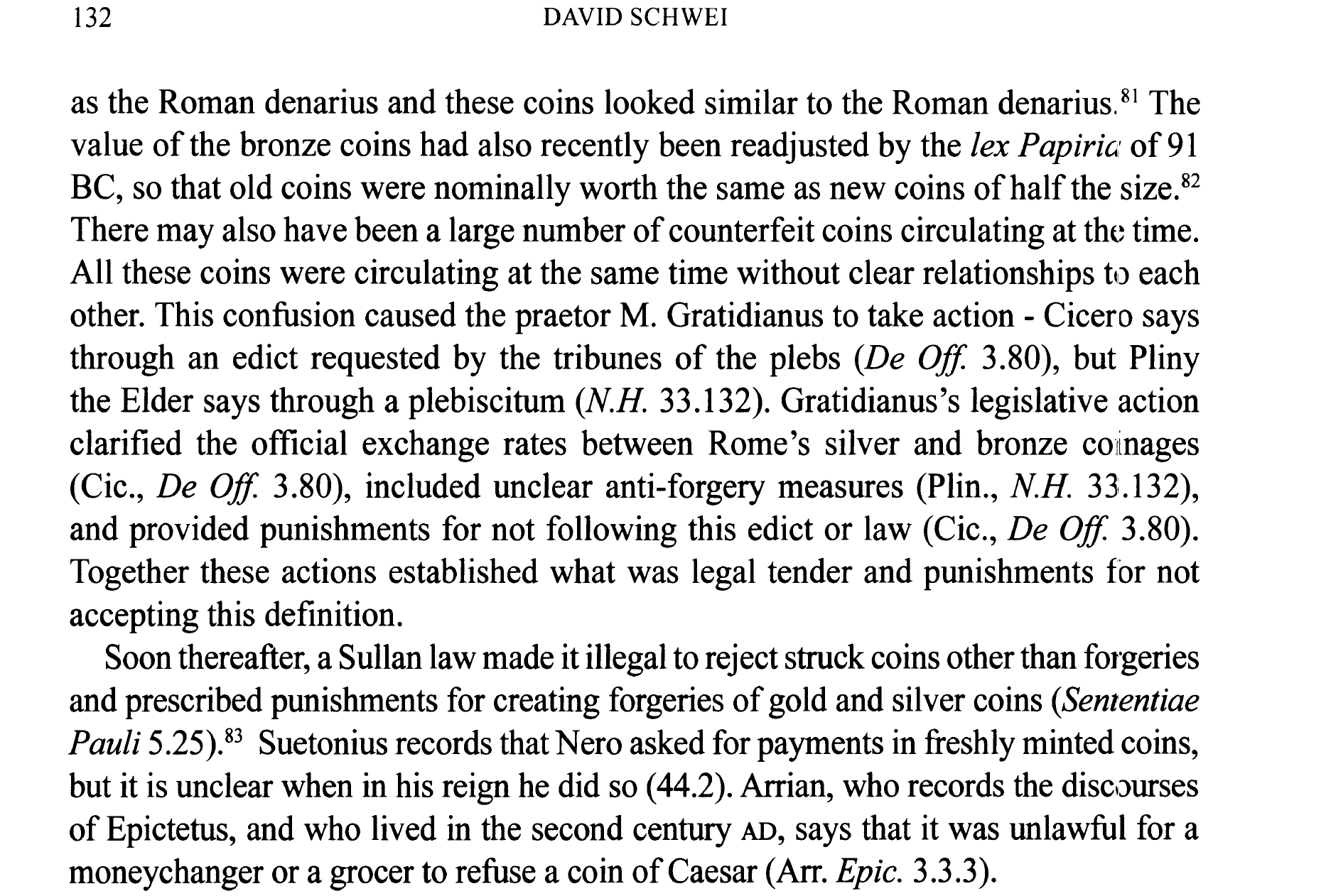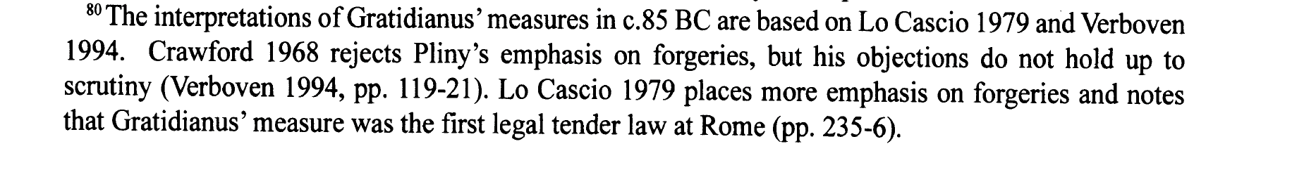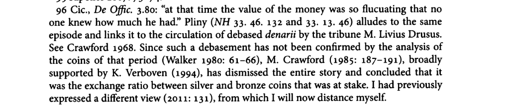 Simply put he sees the substance of Gratidianus’ decree being about accepting coin unless objectively fake, i.e. the terms attributed to a lex Cornelia in the Sent. Paul.